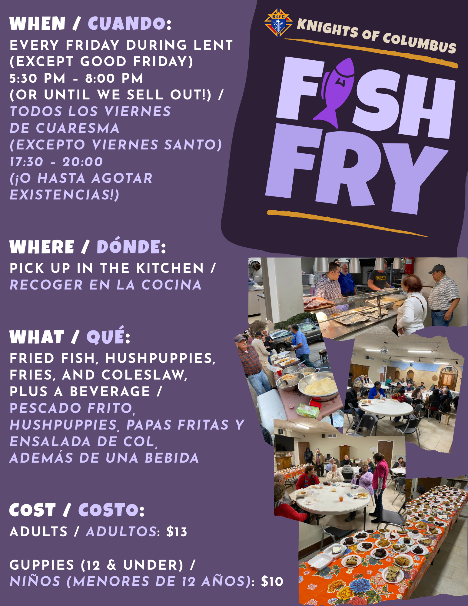 ¡Olvídate de cocinar y únete a los Caballeros de Colón para nuestro pescado frito de Cuaresma semanal! Ya sea que vienes por la comida crujiente o por la comunidad, ¡ven a por un plato antes de que se acabe!